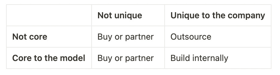As a general principle, you should build solutions that are unique to your company and core to your model - areas where you'll need to iterate most frequently. Everything else can be outsourced, purchased, or obtained through partnerships. However, if you cannot find a partner that meets your quality and speed requirements, it may make sense to bring that capability in-house.